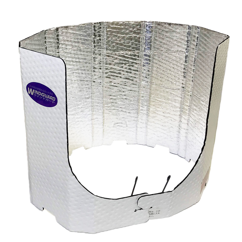 コンロの火を風からガードするウインドガード。使用方法は、前部を大きく拡げピンを地面に差し込むだけ。ご使用時は、鍋の周囲から10cm以上離して下さい。