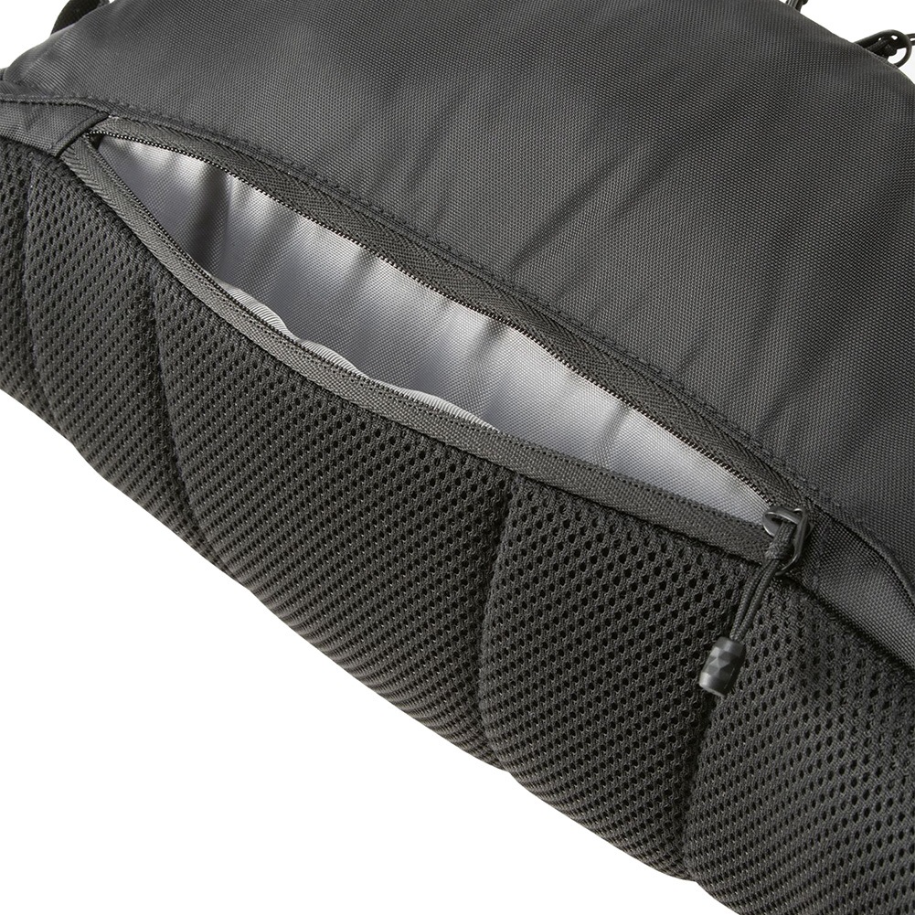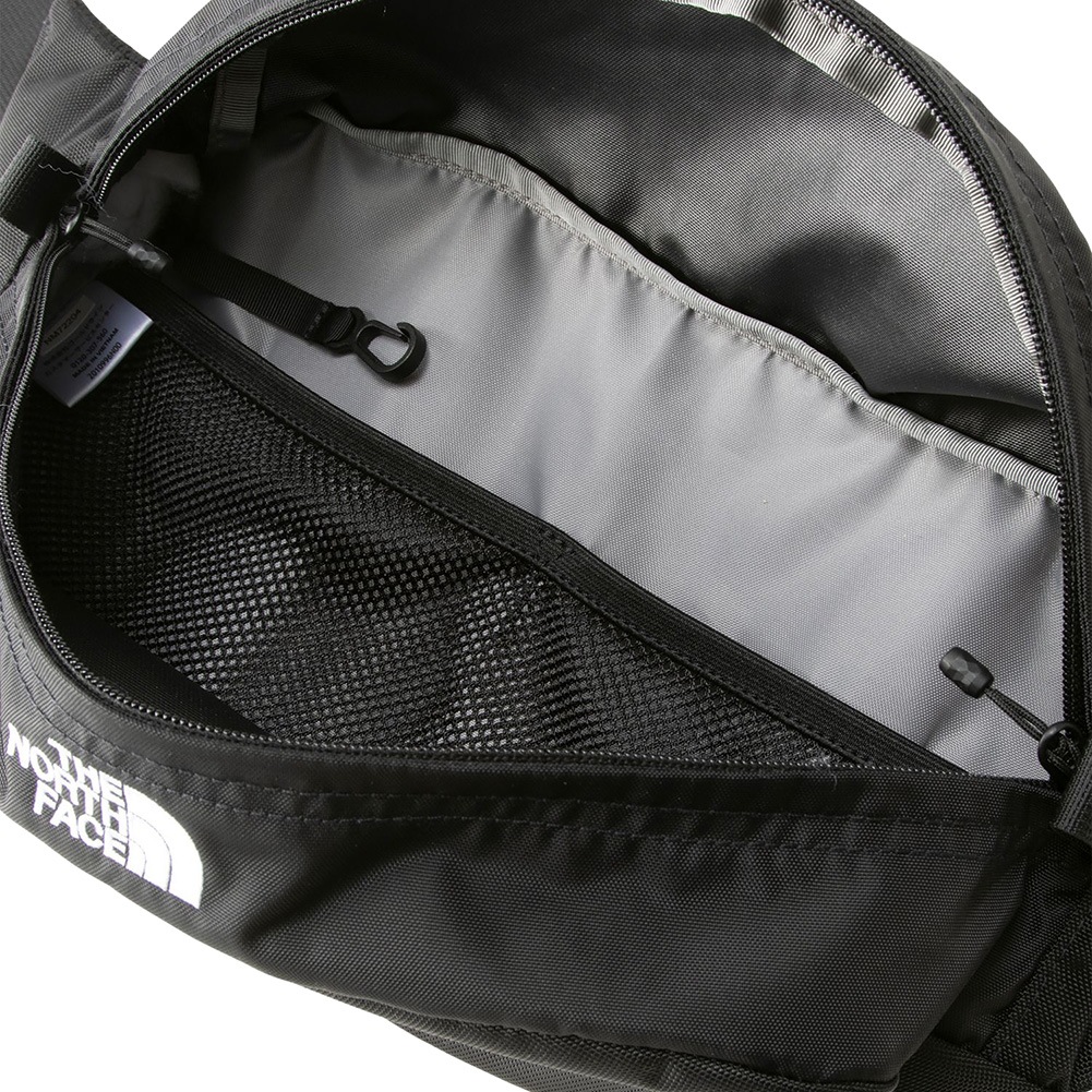 内側にメッシュディバイダーとキークリップつき/背面にファスナーポケット/ウエストのウェビングテープは片引きタイプ