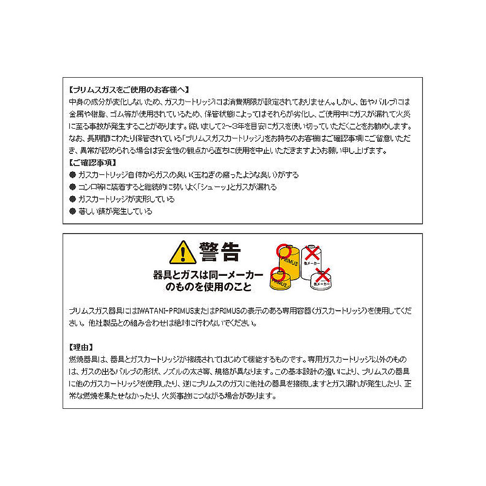 特殊繊維の内張で気化促進効果の高いテクノロジーガス。オールシーズンで使用可能です。頑丈な鋼鉄製の容器の中に、圧縮されて液体になったガス(液化石油ガス)が入っています。ガスカートリッジ上部の口金(バルブ)にプリムスガスこんろやプリムスガスランタンをねじ込んで接続します。器具をねじ込むとガス側のバルブが押し下げられてガスが出るようになります。このバルブはばね式になっていますから器具を取り外しても再度、バルブが閉まる仕組みです。