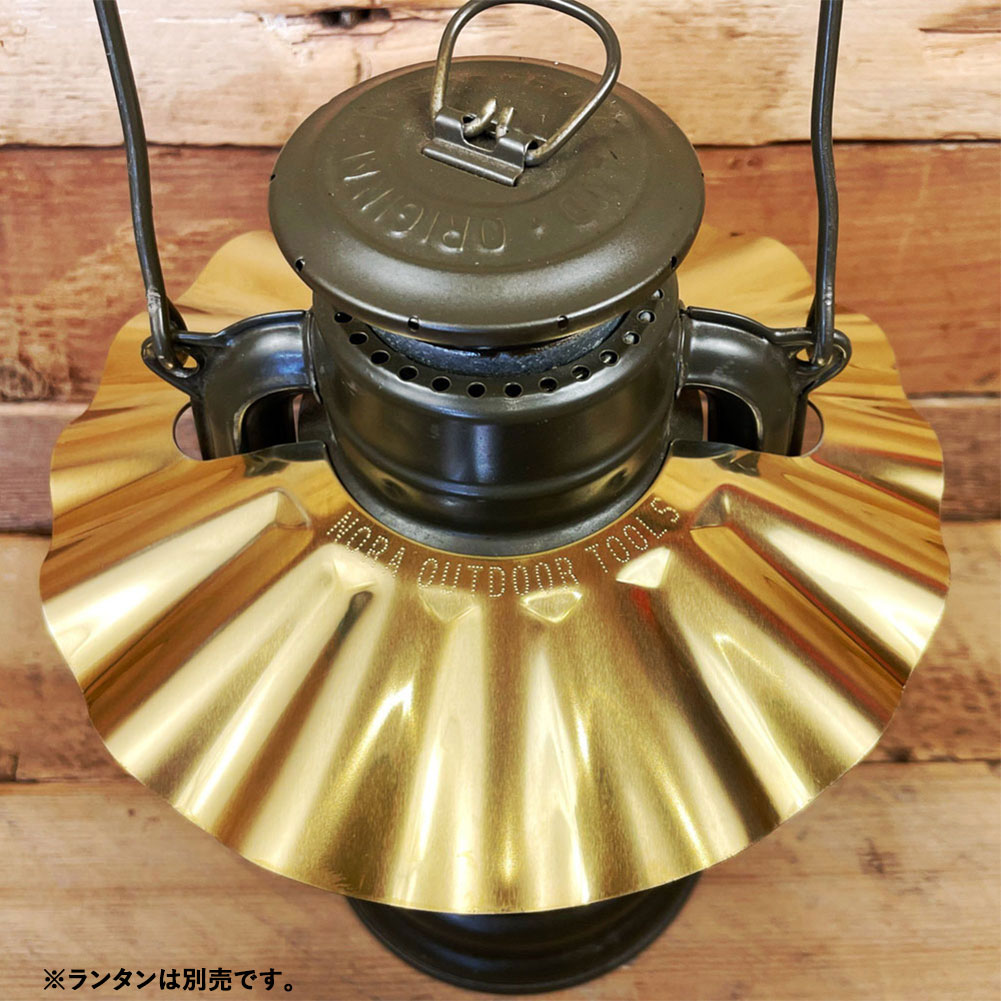 素材は1mm厚の真鍮、一枚モノの板をプレスで仕上げているのでかなりしっかりしてます。直径は190mmと小ぶりに作りました。比較的小型のランタンなので、シェードがあまりに大きいとコンパクトさを損なってしまうためこの大きさにしました。(ただし、小ぶりな分だけシェード性能は落ちてしまいます。びっくりするほど手元が明るくなった!という劇的な効果はありませんので予めご理解ください。)