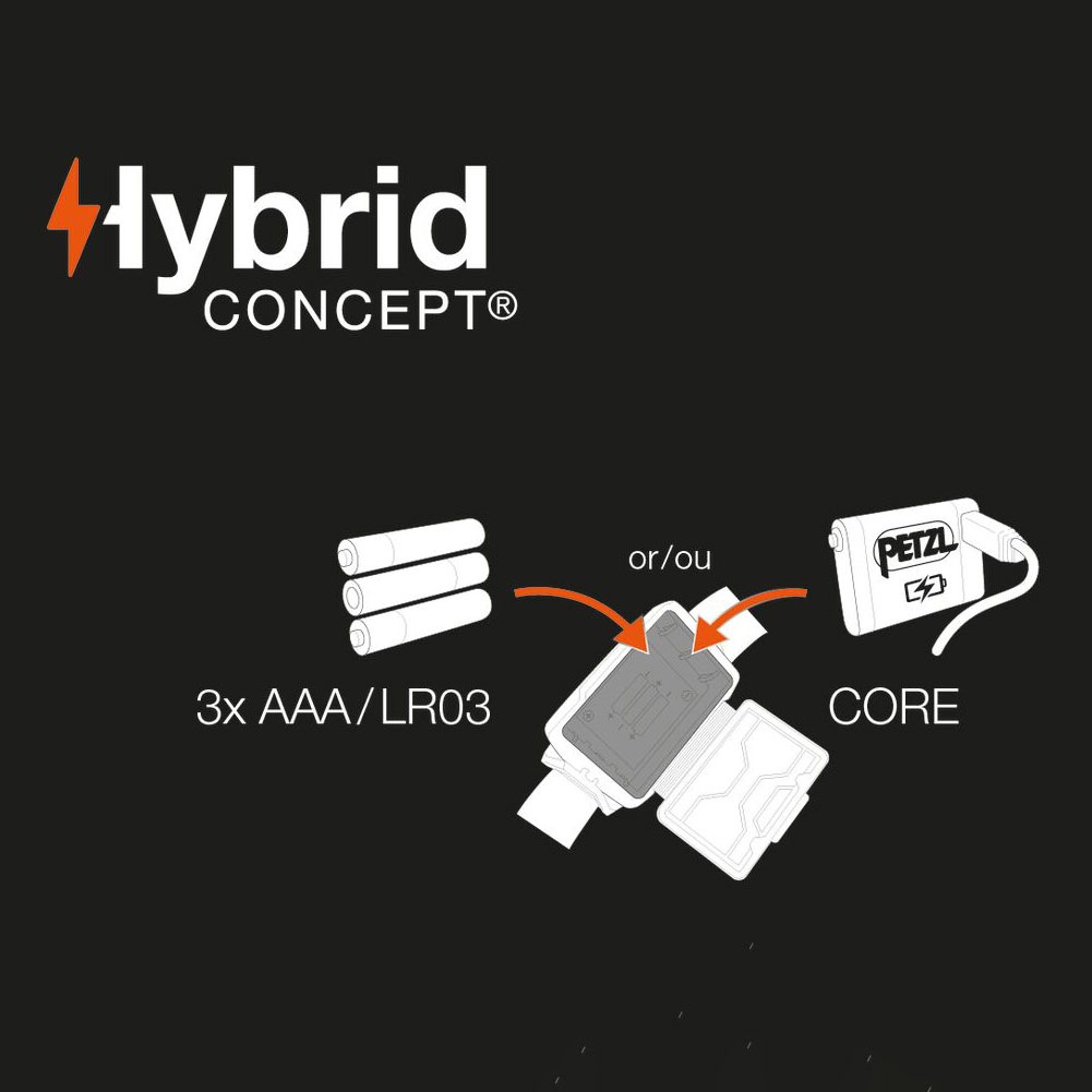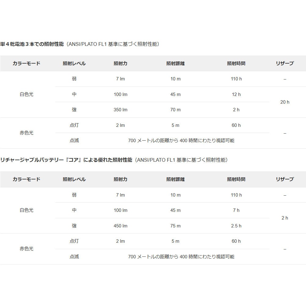 -ハイブリッドコンセプト: 付属の乾電池3本または別売のリチャージャブルバッテリー『コア』で使用可能です。電源を感知することで、電源に応じて照射性能が調節されます