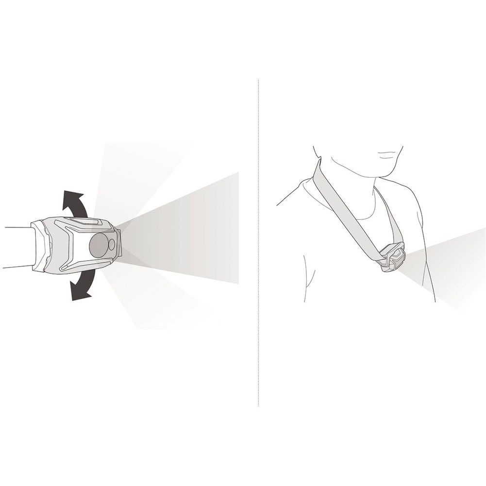 -プレートにより、ランプの向きを上下に簡単に調節でき、首にかけることもできます